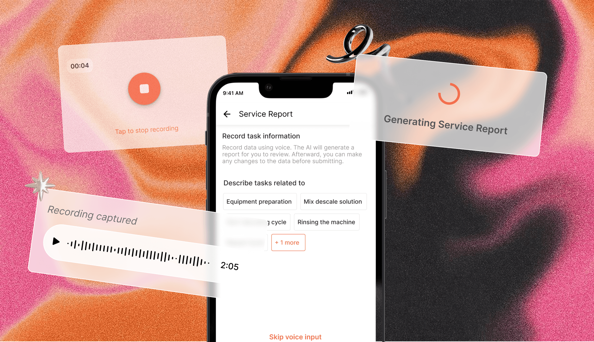 Designed an AI-powered service reporting feature that reduced documentation time from 30 minutes to 5, tailored for the realities of industrial field work.