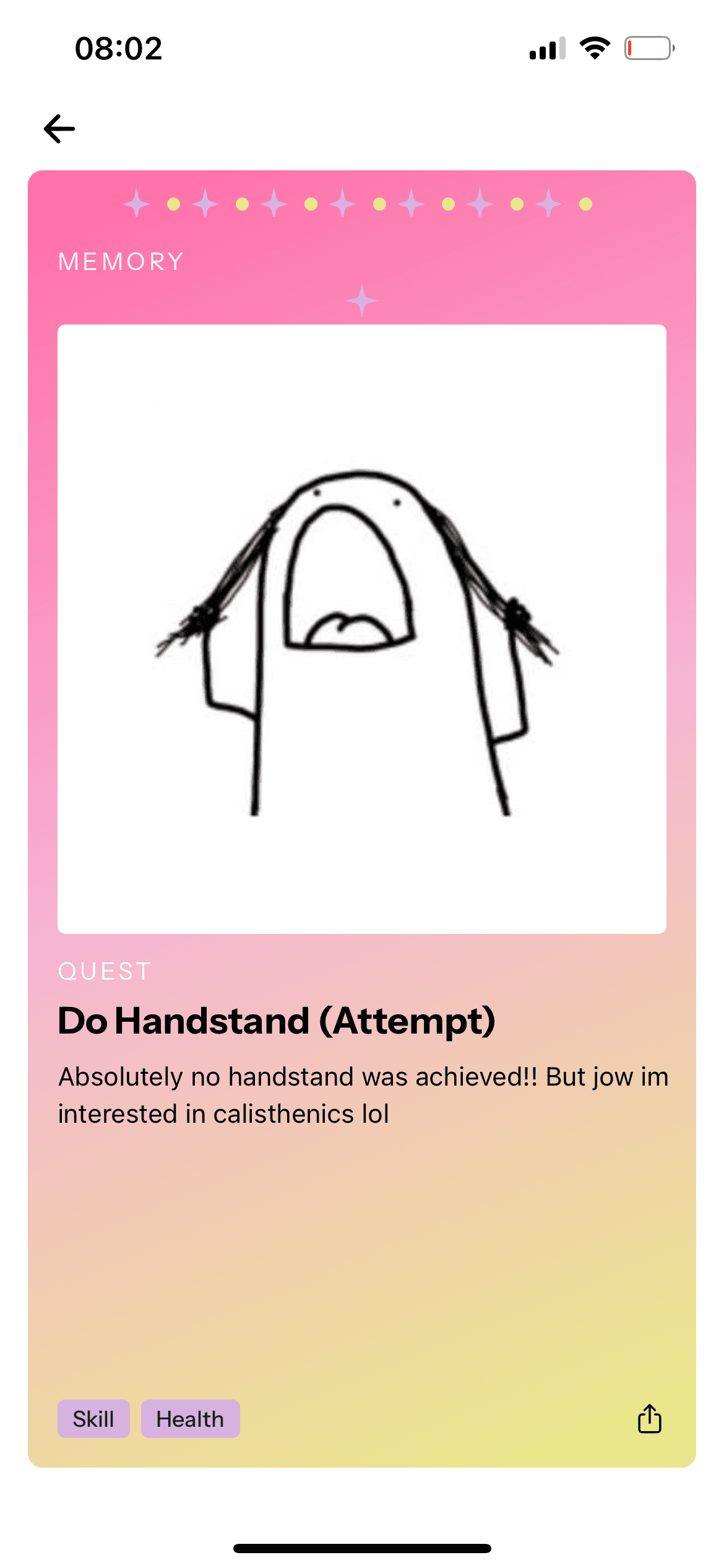 If you don't feel like making any choices at all, you can bypass the filters completely and just pick the curated "Quest of the Week." Once you complete your chosen activity in the real world, the app transforms that achievement into a digital "Memory Card" for you to keep.